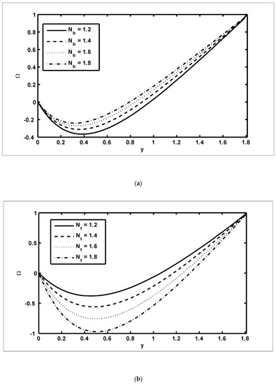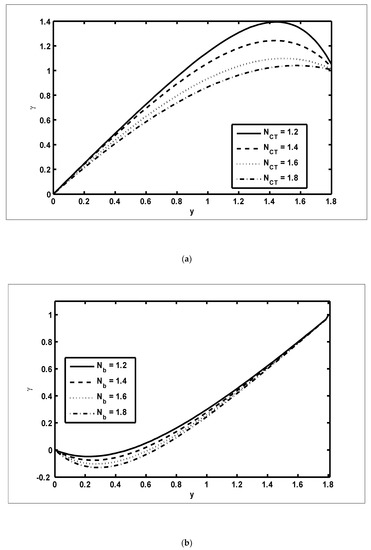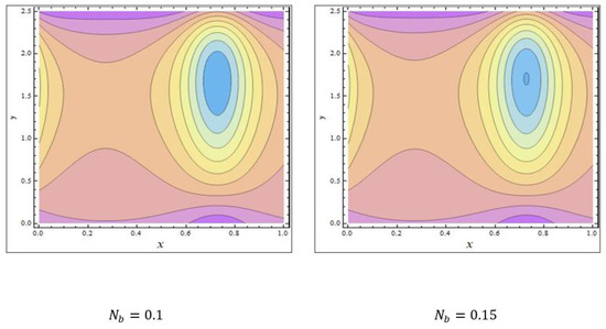 To study the features of the temperature profiles, solute concentrations and nanoparticle fractions, Figure 5, Figure 6 and Figure 7 were plotted. The difference between the temperature of hot gas and cold surfaces produced a valuable source known as thermophoresis. Additionally, this caused the particles to move in the direction of the cold surfaces. It should be noted that in this study, the heat transfer changed as the thermophoresis parameter varied. Figure 5a illustrates that the temperature profiles increased because of the increasing values of Similar effects can be noted in Figure 5b for the case of the Dufour parameter. Physically, it was evident that the Dufour effect, which is also known as the diffusion-thermo effect, characterised the heat flow that was produced whenever the chemical system was subjected to a concentration gradient. It can be seen in Figure 6a,b that the solute concentration profiles decreased because of the increasing values of and This behaviour was because and had a direct relationship with each other. Moreover, it occurred when random motions interacted with of solid nanoparticles through random collisions and micro-mixing, which dispersed the solid nanoparticles and lowered their concentration. Figure 7a,b were drawn to observe the effects of the nanoparticle fractions on and . Increasing values of increased the nanoparticle density, which caused the nanoparticle fraction to grow (Figure 7a), whereas the nanoparticle fraction decreased with an increase in Figure 7b. When increased, the fluid viscosity lessened, which resulted in a reduction in the nanoparticle fraction of less dense particles.