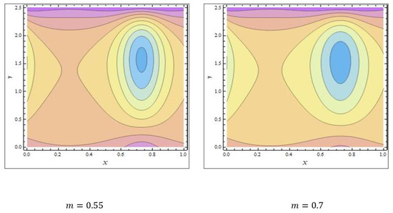 In peristaltic propulsive flows, trapping is a rare phenomenon. It starts with the formation of a fluid mass that moves internally and is encircled by peristaltic wave streamlines. Using peristaltic waves with high rates of flow and substantial occlusions, streamlines catch the mass of fluid and propel it along. To study the phenomenon of trapping, Figure 8, Figure 9 and Figure 10 were plotted. The streamlines for the discrete values of are represented in Figure 8, which shows that with the enhanced values of , the number and size of the trapped masses increased, while they decreased with increasing values of (Figure 9). The streamlines for the different wave forms are shown in Figure 10. A comparison between this work and others in the available literature is presented in Table 1. It was noted that our results agreed with the results for viscous fluid and those of Bég and Tripathi [37].