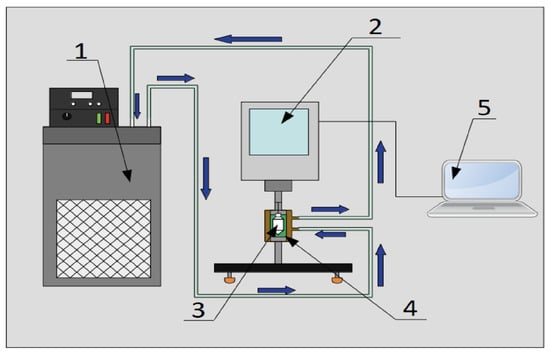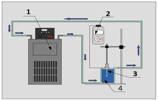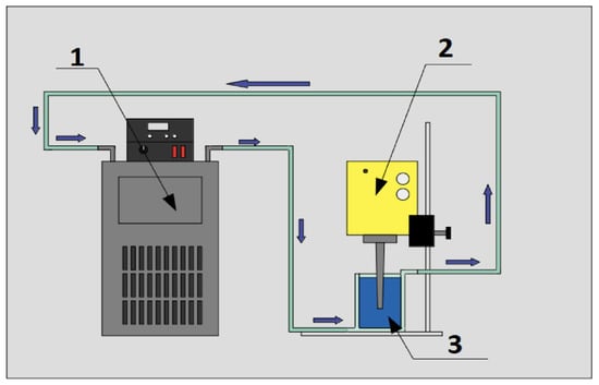 To analyze the rheological behavior of the sample and the variation in the viscosity with respect to temperature, a Brookfield viscometer, model DV2T-LV, and spindle SC4-18 were used. The measurement process began with the assembly of the viscometer, which had to be leveled using the bubble level included in the equipment, to perform self-zeroing. Then, the instrument was connected to a computer with the “RheocalcT” software; then, the test parameters, such as RPM and measurement times, were entered into the software. Next, the spindle and the double-jacketed vessel, which was previously connected to a refrigerated circulation bath, were installed. Finally, the small sample adapter S4C-13R containing 7 mL of working fluid was connected to the double-jacketed vessel and the spindle was immersed in the sample so that the measurement could be performed Viscosity measurements were performed for eight temperatures, from 293.15 K to 328.15 K, with 5 K steps between temperatures, obtaining 5 measurements of the property per temperature level, with spindle rotation speeds up to 80 RPM and with steps of 10 RPM between levels. The setup can be seen in Figure 5.