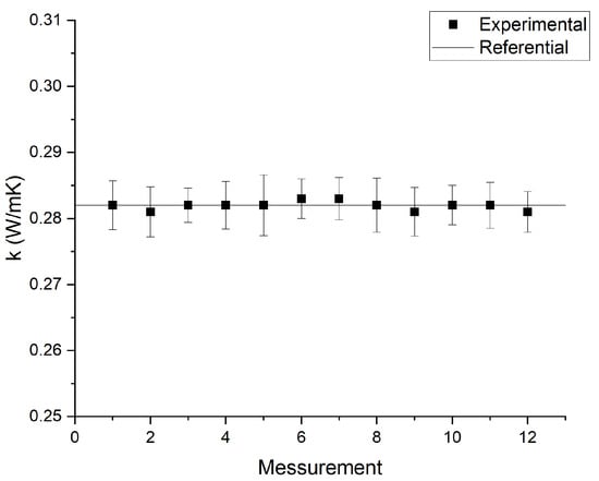 For calibration of the thermal conductivity measurement equipment, a traceability process was necessary. The traceability process of the thermal properties analyzer required 12 thermal conductivity measurements on glycerin (CAS 56-81-5), whose thermal conductivity is 0.282 W/mK at 293 K. The glycerin was supplied by the equipment manufacturer as standard material for the KS-1 probe. Figure 4 shows the obtained traceability results. A non-parametric Mann–Whitney test was performed to examine whether the experimental results obtained from the thermal properties analyzer differed from the reference.