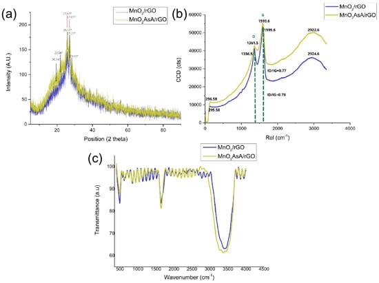Figure 6a shows the X-ray diffraction pattern of the nanocomposite. The maximum peak of the rGO-MnO nanocomposite is observed at 2 = 27.27, which corresponds to rGO. It also appears for parameter (002) hkl in the form of the restoration of the graphitic structure in rGO after GO reduction with the removal of the oxygen residues between the graphitic layers. For MnO, it is observed at angles of 2 = 20.1 and 28.6, while Mn is observed at 2 = 22.06[]. It can be observed that the MnO/rGO has an overlapping of peaks at a reflection angle of 2 = 26.1, which corresponds to the (002) plane of rGO []. For the MnOAsA/rGO nanocomposite, two maximum peaks are observed at 2 = 25.67 and 2 = 27.09, where the coupling of the MnO/rGO signals occurs, in addition to the displacement of the position and intensity of these peaks, a product of the functionalization of the nanocomposite with ascorbic acid.