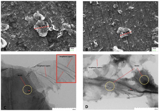 The morphologies of the nanocomposites were analyzed by SEM. Figure 7A,B represent low-magnification SEM images of the MnO/rGO and MnOAsA/rGO nanocomposites, respectively, which show a large number of agglomerated flakes with a diameter of 10 m and above. The magnified images of these flakes show thin graphene sheets and decorated MnO nanoparticles on the surface. The TEM micrographs in Figure 7C,D show very small-sized 5 nm MnO nanoparticles distributed over the surface of the reduced graphene oxide. Moreover, a higher number and better distribution of nanoparticles on the surface can be observed due to the role of ascorbic acid. On the other hand, the graphene sheets in Figure 7A,B have sizes in the order of micrometers for one of their dimensions, which makes rGO a 3D material, i.e., a material that exhibits nanocrystalline characteristics and nanostructure behavior, unlike MnO, whose size is lower than 100 nm [].