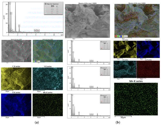 The EDS was performed (model SEM Zeiss EVO MA|10) to obtain a quantitative elemental analysis of the MnO/rGO and MnOAsA/rGO nanocomposites. In Figure 8a,b, the presence of the main elements of the nanocomposite, such as oxygen, carbon and manganese, can be observed. In addition, the presence of a small amount of sulfur in both samples may be due to the acid (HSO) used for the synthesis of GO by Hummers’ method. On the other hand, when comparing both figures, a decrease in the percentage of oxygen can be observed for the nanocomposite of MnOAsA/rGO, due to the better reduction of the oxygen-containing functional groups due to presence of ascorbic acid before GO reduction. Figure 8a shows that the carbon and manganese content is 52.3 wt.% and 0.3 wt.% for the MnO/rGO studied zone, similarly occurring in the three spectra of zone 2 of the MnOAsA/rGO sample (Figure 8b), where the content of carbon and manganese amounts to 56 wt.% and 0.1 wt.%, respectively.