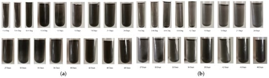 Initially, a qualitative study was carried out to obtain photographs of both nanofluids over a time period of 48 days. Figure 9 shows both nanofluids placed vertically, and it can be observed that both nanofluids are stable, presenting the minimum precipitation of nanoparticles in both cases. Nevertheless, we observed that the MnOAsA/rGO nanofluid showed slightly higher stability compared to the MnO/rGO nanofluid.