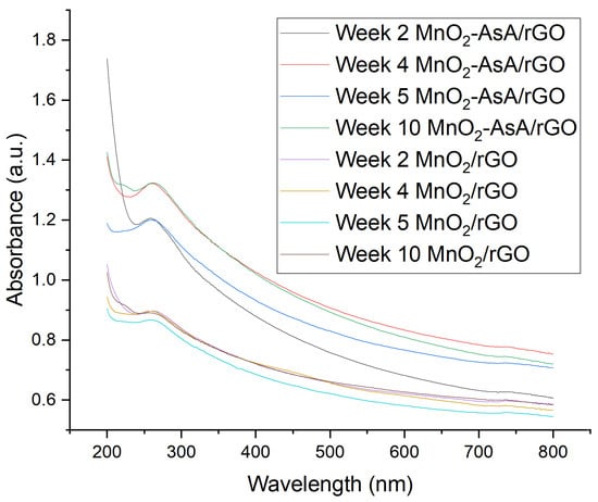 An UV–Vis analysis complemented the qualitative study of the nanofluids’ stability. UV–Vis analysis confirmed the stability of both nanofluids over time since the absorbance presented minimal variation during the time period (Figure 10). The MnO/rGO and MnO-AsA/rGO nanofluids presented maximum absorbance variation of 0.030 and 0.122 , respectively.