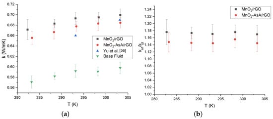 (a) Thermal conductivity of the nanofluids based on MnO/rGO composites versus temperature and (b) relative thermal conductivity of nanofluids synthesized with of the nanofluids based on MnO/rGO composites respect to the base fluid. The error bars (a) correspond to the measurements’ standard deviation and the propagation error (b) according to Equation (6).
