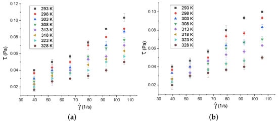 The behavior of the shear stress with respect to the strain rate was also studied for both synthesized nanofluids, in the temperature range of 293 K to 328 K (Figure 12). To study the rheology of nanofluids, the Newtonian model was used, making a linear adjustment between the shear stress and the strain rate by means of the method of least squares. This model was used since, in the literature, graphene nanofluids (GO, graphene nanosheets, decorated GO, rGO and graphene nanoplatelets) exhibit Newtonian behavior [,,,,,].
