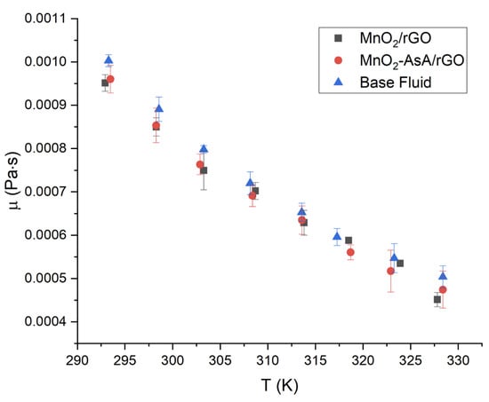 Dynamic viscosity versus temperature of MnO/rGO nanofluids at a concentration of 0.1 wt.%. The error bars correspond to the measurements’ standard deviations.