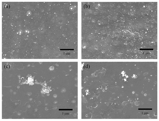 SEM images of Ag/ABS samples synthesized by using radiation. (a) Gamma ray, without 2-prop.; (b) Gamma ray, with 2-prop. (10% vol.); (c) Electron beam, without 2-prop.; (d) Electron beam with 2-prop (10% vol.).