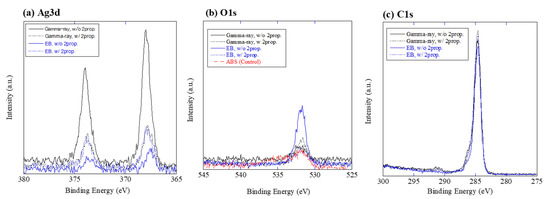 Note that Equation (1) represents water radiolysis, and that the hydrogen atoms and hydrated electrons generated are strong reductants capable of reducing Ag+ to metallic Ag0. In the presence of 2-propanol, the radicals of H• and OH• are scavenged to form alcohol radicals, in accordance with the Equations (2) and (3), and the generated radicals also contribute to the reduction of Ag+. Metallic Ag nuclei grow up in aqueous solutions to form metallic Ag nanoparticles, which are immobilized on the surface of the support resin as a way of minimizing their surface energy. As shown in the XPS analysis, Ag on ABS substrate were partially oxidized, which are assumed to be surface oxidization of nanoparticles by the surrounding atmosphere. It is also necessary to consider the effect of irradiation on the resin substrates, as ionizing radiation could induce direct and/or indirect action on polymers. However, as shown in XPS analysis data, the chemical change on the resin surface seems to be almost negligible under the presented irradiation conditions. Since the irradiation dose is equal or less than that used for the sterilization of medical equipment, deterioration of the resin substrates scarcely proceeded [10].