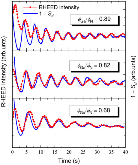 - Adelmann, C.; Brault, J.; Jalabert, D.; Gentile, P.; Mariette, H.; Mula, G.; Daudin, B. Dynamically stable gallium surface coverages during plasma-assisted molecular-beam epitaxy of (0001) GaN. J. Appl. Phys. 2002, 91, 9638–9645. [Google Scholar] [CrossRef]