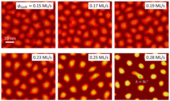 Figure 6 shows the film morphologies simulated for values of between 0.15 and 0.28 ML/s. The N flux has been set at ML/s. As can be observed, for less than ML/s (), the SK transition competes with the kinetically induced formation of extended 2D platelets: in this regime the mobility of the adatoms on the surface, directly dependent on the ratio , is not high enough to promote the nucleation of 3D precursor islands well defined and separated from each other. Therefore, the system partially relaxes its elastic energy by means of a rough surface instead of through a genuine 2D-3D transition. This behavior generally agrees with that observed in growth experiments [18,19]. Furthermore, for simulations with increasing beyond , we observe a significant increase in the average island height, along with a slight decrease in the diameter, together with a progressive size homogenization. The origin of this trend lies in the decrease in both the diffusion barrier and the binding energy (that can be associated to an increase in the effective mobility of the adatoms) as increases, so that the diffusion of the GaN adatoms across the surface is predominantly determined by the inhomogeneities in the elastic energy. Therefore, the precursor 2D islands slow down their lateral growth earlier than for growth under lower , and the SK transition to 3D growth sets is clear. Our calculations (not shown) also demonstrate that for Ga fluxes beyond ML/s, the QD density decays linearly as we get closer to the stoichiometry (which corresponds to ML/s). Simulations carried out considering a higher N flux of value ML/s (not shown here) reveal a tendency of the GaN layer to relax its elastic energy via the formation of irregular islands of small height and large diameter (instead of fully developed 3D dots), with essentially constant density.