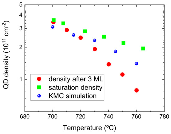 QD density obtained from the KMC simulations as a function of temperature (blue circles). For comparison, we also display two sets of experimental densities (red circles and green squares) measured in Ref. [21] (see text).