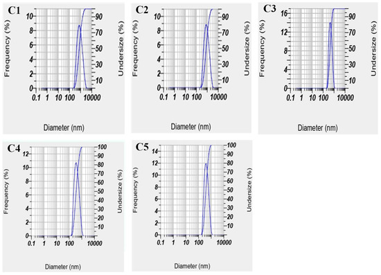 Particle size distribution of SLN-ferrous sulfate at various formulations (C1, C2, C3, C4, and C5) by particle size analyzer.