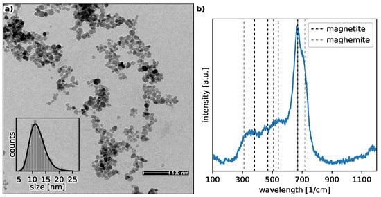 Panel (a) shows the TEM image for the bare MNP from the solution at the . The nanoparticle-size distribution histogram and the log-normal function with the fitted parameters = 11.7 nm and = 0.24 are presented as the inset. Panel (b) presents the Raman spectrum for the bare MNP with the positions of distinctive Raman peaks for magnetite and maghemite.