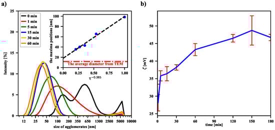 The values of the zeta potential—estimated from experimentally determined electrophoretic mobilities of agglomerates—are presented in panel (b) in Figure 3. They suggest the increase of the zeta potential with the sonication time. However, it should be noted that the used particle number and zeta potential analyzer gives measurement results based on the Smoluchowski model. The observed measurement result could also be influenced by the magnetic dipole-dipole interactions between magnetic nanoparticles. Thus, in Figure 3b we observe an increase in the zeta potential after sonication, but a more complex model, taking into account the specificity of the magnetic suspension, should probably be used. A separate issue is that of re-agglomeration of the iron oxide nanoparticles, because the more dispersed the nanoparticles, the greater the excess free energy associated with the presence of the surface. As a result, after some time of continuous sonication, the number of nanoparticles undergoing re-agglomeration becomes comparable with the number of particles formed during the collisions of agglomerates. A similar effect has recently been observed for non-magnetic nanofluids, showing that there is an optimal sonication time to obtain the best dispersion of the suspension in the ultrasonic process [].