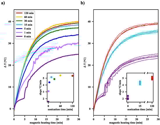 Both panels show how changes during the RFMH process for suspensions treated with ultrasound. Before the sample was placed in the coil of the RFMF generator, so its temperature was equalized with the temperature of the water entering the cooling system; therefore, the starting was around zero. Panel (a) shows the dependency of on the time of magnetic heating for suspensions treated with ultrasound. The series of curves on the panel (b) presents the spread of the curves for the three series of measurements, where each series of samples was taken from the same vial. Each series of samples was taken from the same vial (with the suspension not sonicated or sonicated for 15 or 120 min, respectively). In both insets, the initial slopes of the curves were determined during magnetic heating in the range of 30–90 s when the increase rate was almost linear. Measurements on the two panels were taken on different days, but all samples were from the same synthesis.