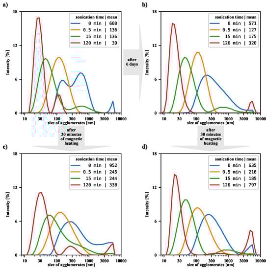 At this point, let us answer the question of to what extent magnetic heating affects the size distribution of suspensions previously subjected to the sonication process of different duration. Figure 5 presents the intensity-based size distributions, before and after magnetic heating, for a few exemplary sonications. The case of untreated suspension, the starting point for this study, was discussed in our previous article []. We were then interested in the efficiency of filtering large agglomerates from the suspension, so our analysis focused on the particles remaining in the supernatant. In the current study, the magnetically heated suspension is shaken first before DLS measurement, so there is no loss of nanoparticles, and an overall shift in the size distribution towards the larger size is observed. Comparing each top panel with the corresponding bottom panel in Figure 5, it can be seen that, in general, the magnetic heating causes an increase in the number of aggregates in all tested suspensions. For suspensions that have been sonicated for half a minute and not sonicated, the size distributions are significantly shifted towards the larger value. On the other hand, for suspensions that are sonicated for a long time, the changes are no longer as pronounced, but an increase in the number of agglomerates is also noticeable.