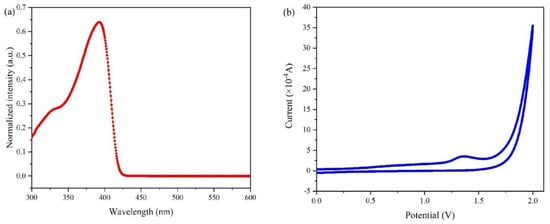 (a) UV−vis absorption spectrum of PTAA in chlorobenzene solution; and (b) cyclic voltammetry curve of PTAA in chlorobenzene solution.