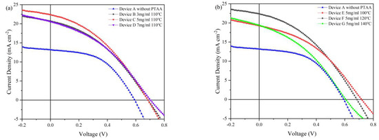 The thickness of HTL is important for optimizing the architecture parameters of solar cells. If the HTL is too thin, it is difficult to form an effective junction when coupling with the light absorption layer. As a result, the HTL is less effective for promoting carrier extraction rate. On the other hand, if the HTL is too thick, the parasitic resistance of the device will increase and thus harm the device performance. We further tested the performance of the device with different thicknesses of PTAA. All the devices with the same architecture of ITO/ZnO/CdSe/CdTe/HTL/Au were prepared at the same conditions except that the HTL thickness used different concentrations of PTAA solution. The structure of the control device A was ITO/CdSe/CdTe/Au. The structure of device B, C and D was ITO/CdSe/CdTe/PTAA/Au where the PTAA concentration was 3, 5 and 7 mg/mL, respectively. The structure of devices E, F and G was ITO/CdSe/CdTe/PTAA (5 mg/mL)/Au where the PTAA annealing temperature was 100, 120 and 140 °C, Device H was ITO/ZnO/CdS/CdSe/CdTe/Au and Device I is ITO/ZnO/CdS/CdSe/CdTe/PTAA (5 mg/mL) with 120 °C annealing/Au, respectively. Figure 4a exhibits the current density–voltage (J–V) curves of the NC solar cells with or without PTAA HTL, and Figure 4b shows the J–V curves of devices with different PTAA HTL annealing temperatures. The device performance is summarized in Table 1. The control device without HTL showed a Voc of 0.58 V, short circuit current density (Jsc) of 14.61 mA·cm−2 and a fill factor (FF) of 0.42, delivering a low PCE of 3.58%. In contrast, with the PTAA concentration increase from 3 to 7 mg mL, device performances were effectively enhanced. At the PTAA concentration of 5 mg/mL, we obtained the champion device which showed a Jsc of 21.06 mA·cm−2, a high Voc of 0.68 V and a FF of 0.37, resulting in a high PCE of 5.41%. Obviously, the Jsc and Voc of devices with PTAA HTL are simultaneously improved. The PCE of a device with PTAA is over 50% higher than the control device. From Table 1, one can see that the improvement of efficiency in NC solar cells with PTAA HTL is mainly attributed to the increase in Voc (from 0.58 to ~0.68 V) and Jsc (from 14.61 to 21.06 mA/cm2). As a result of the high-quality diode, the photo-induced electron-hole pair could be effectively separated by the built-in electric field (Vbi). Combining the data shown in Figure 4a and Table 1, it can be seen that the optimized PTAA solution concentration is located at 3~5 mg/mL. Lower concentration of PTAA may result in inadequate coverage of the CdTe thin film surface, and higher concentration of PTAA may lead to large parasitic resistance which increases the Rs of the device.