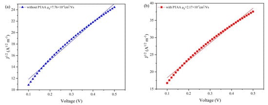 SCLC measurements of holy−only devices: (a) without; and (b) with PTAA (device structure: ITO/CdTe (200 nm)/PTAA/Au.