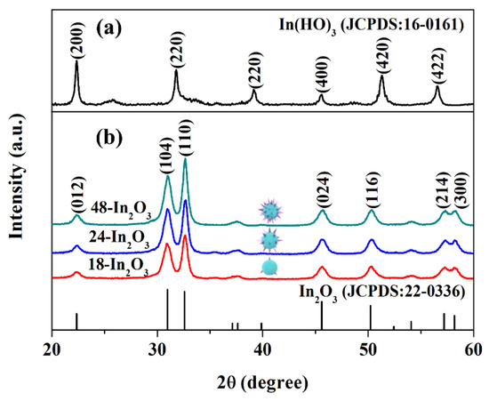 The purity and phase structure of the samples were characterized by XRD. As shown in Figure 1a, the peaks located at 22.29°, 32.28°, 45.42°, 51.82° and 55.82° are assigned to the (200), (220), (400), (420) and (422) crystal facets of In(OH)3. All diffraction peaks are consistent with the cubic phase In(OH)3 (JCPDS No. 16-0161), revealing that the first step of hydrothermal reaction formed the In(OH)3 phase. As In(OH)3 can be decomposed into In2O3 at high temperature, In(OH)3 obtained by the hydrothermal method is used as the precursor for the formation of In2O3. According to the TG-DTA analysis result (Figure S1), 400 °C is selected as the self-pore-forming calcination temperature to synthesize In2O3. One can see from Figure 1b that 18-In2O3, 24-In2O3 and 48-In2O3 all have diffraction peaks at 22.37, 30.99, 32.61, 45.61, 50.25, 57.2 and 58.19°, which can be well indexed to the (012), (104), (110), (024), (116), (214) and (300) crystal facets of hexagonal structure of In2O3 (JCPDS No. 22-0336), respectively. No other diffraction peaks were found in the XRD patterns, which indicated that the prepared samples possess high purity. At the same time, we observed that the XRD peak intensity of the samples increases gradually with the prolongation of hydrothermal reaction time, which not only improves the crystallinity of the samples, but also affects the average crystallite size and lattice strains of the samples. The average crystallite size (D) and lattice strains (ε) of three samples were calculated by Debye–Scheller Formulas (1) and (2).