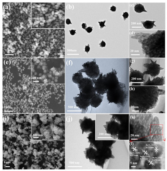 (a) FESEM image and (b–d) TEM image of the 18-In2O3; (e) FESEM image and (f–h) TEM image of the 24-In2O3; (i) FESEM image, (j,k) TEM image and (l) HRTEM image of the 48-In2O3.