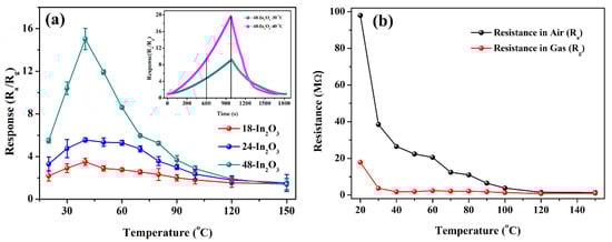 It is well known that the working temperature is one of the important factors for affecting the gas sensing performance of the sensor. In order to determine the optimal working temperature, the functional relationship between the responses of sensors based on the samples of 18-In2O3, 24-In2O3 and 48-In2O3 to 500 ppm methane and the working temperature were tested, and the results are shown in Figure 5a. Within the range of 20–150 °C, the responses of these 3 sensors ranked as 18-In2O3 < 24-In2O3 < 48-In2O3, and the response curves of these 3 sensors exhibited a mountain-like change trend, and reached their maximum responses values at 40 °C. At low temperature, CH4 is relatively stable and does not easily cause potential safety hazards such as combustion and explosion. Therefore, methane sensors are bound to develop in the direction of low temperature, or even room temperature detection, and the sensitivity should also be considered. Taking 48-In2O3 sample as an example, when the temperature is changed around 40 °C, its response value changes significantly. The response values of the 48-In2O3 sensor at 30 °C, 40 °C and 50 °C are about 10, 16 and 12, respectively, which demonstrates that working temperature has a huge effect on the response of the sensors. This may be because the working temperature plays an important role in the dynamic equilibrium of adsorption, reaction and desorption of target gas molecules. If the temperature is too low, the activation energy is too low for CH4 molecules to fully react with the adsorption oxygen. As the temperature increases, CH4 molecules desorb on the surface of the material before the full reaction. From the Figure 5a, we can see that the response of the 48-In2O3 sensor to 500 ppm CH4 at 30 °C is still about 10. The inset in Figure 5a shows the real-time response–recovery curves of the 48-In2O3 sensor to 200 ppm methane at 30 and 40 °C. It can be seen that the extended response time of the sensor still cannot reach a stable platform, and the two curves have the same trend of change and the response–recovery speed is close. Therefore, in order to test whether the In2O3 sensor has good gas sensitivity to methane at near room temperature, 30 °C was chosen as the best working temperature to detect the next gas sensitivity, and the response time was uniformly controlled at 600 s. Figure 5b shows the variation in the resistance (Ra and Rg) of the 48-In2O3 sensor with the working temperature. With the working temperature increases, the value of Ra decreases continuously, which may be related to the semiconductor property of In2O3 [18,19]. When the 48-In2O3 sensor is exposed to 500 ppm methane gas, the Rg value is also reduced, which may be due to the reducing nature of methane gas [19]. The largest change in the resistance of the sensor is from Ra = 26.5 MΩ to Rg = 1.763 MΩ at 40 °C. The large change in the resistance of the sensor (Ra to Rg) results in an enhanced response of the 48-In2O3 sensor to methane.