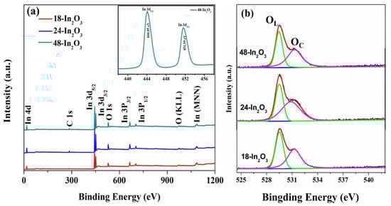 As is shown in Figure 8a, In and O elements were detected in these three samples, and the C peak was the C contamination introduced during the XPS spectrum characterization [32]. The inset of Figure 8a displays the high resolution In 3d XPS spectrum of the 48-In2O3 sample. One can see that the In element is detected with two peaks at the binding energies of 444.05 eV and 451.59 eV, assigned to In 3d5/2 and In 3d3/2, respectively. The energy separation was 7.54 eV, which is consistent with In2O3, indicating that the oxidation state of In is In3+ [33]. Figure 8b shows the high-resolution O 1 s spectra of the three samples for further analysis. The O 1s spectra of the three samples can be fitted to three oxygen peaks, corresponding to lattice oxygen (OL) and adsorbed oxygen (OC). It has been reported that adsorbed oxygen plays a key role in the gas sensing reaction on the surface of semiconductor oxides by regulating the interaction with the target gas [31,32,34]. The adsorbed oxygen content of the three samples is shown in Table 3. With the prolongation of the hydrothermal reaction time, the percentage of adsorbed oxygen increased gradually. When the hydrothermal reaction reached 48 h, the highest content of adsorbed oxygen was obtained in 48-In2O3. The higher the content of adsorbed oxygen, the more reaction sites can be provided, thus improving the gas sensitivity.