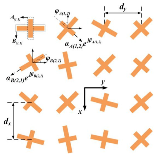 In this section, the theory to realize decoupled multi-mode vortex beams is introduced. Figure 1 illustrates the schematic of the proposed dual-LP strategy. The array contains elements with the periods dx and dy along the x and y axis, respectively. The element can be considered to be composed of two sub-elements that are marked as Amn and Bmn with different ports, contributing to two orthogonal LP radiations, which can be described as , here m = 1, 2, …, M; n = 1, 2, …, N. The rotation angle φA(m,n), φB(m,n) and excitation phase βA(m,n), βB(m,n) of mnth element are nonuniformly distributed. Here, we take subarray A as an example and assume there is no coupling between A and B. The gradients of rotation angles and excitation phases along the x and y axis are defined as (φx, βx) (φy, βy), and thus the phase distribution can be represented by φA(m,n) = [m − (M + 1)/2]φx + [n − (N + 1)/2]φy and βA(m,n) = [m − (M + 1)/2]βx + [n − (N + 1)/2]βy, respectively.