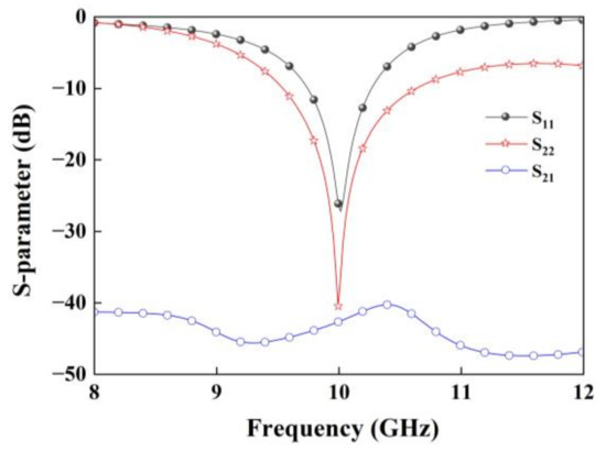 The element is numerically simulated by the simulation package of High Frequency Structure Simulator (HFSS), and the simulated S-parameters of the proposed dual-LP element is shown in Figure 3. In calculations of S parameter, we only calculate an element with radiation boundary conditions that are imposed at distance 10 mm away from the element, while two lumped ports placed at Port 1 and Port 2 to transmit orthogonal linearly polarized beams. It can be seen that the simulated |S11| and |S22| below −10 dB are observed over the bandwidths of 9.81–10.35 GHz and 9.56–10.67 GHz, and the isolation between the two ports is better than −38 dB.