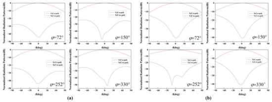 The co-polarization and cross-polarization radiation patterns of the sub-element that was fed separately by Port 1 and Port 2 in cartesian coordinate system are illustrated at 10 GHz in Figure 4. For convenience and clear identification, all the far-field patterns at each deflection angle were normalized to their maximal intensity of co-polarized components at an azimuthal plane of ϕ = 72°, 150°, 252°, and 330°, where four vortex beams will be deposited. As plotted in Figure 4a, when Port 1 is fed separately, the co-polarization component (X) remains above −3 dB in range ±44°, and in this region, the intensity of the cross-polarization component (Y) is below −27 dB in the plane of ϕ = 72°, 150°, 252°, and 330°. In contrast, the co-polarization component (X) remains above −3 dB in the range of ±42° when Port 2 is fed separately, and in this region the cross-polarization component (Y) intensity is below −23 dB in the plane of ϕ = 72°, 150°, 252°, and 330°, indicating that the element that is fed by both two ports exhibits high LP performance.