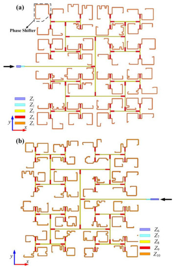 Layouts of the (a) upper and (b) bottom feeding network for the quad-vortex-beam array in Case I.