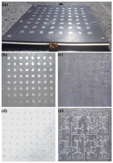 Photographs of the final fabricated quad-vortex-beam planar microstrip array. (a) Assembled model, (b) radiating elements, (c) upper feeding network, (d) ground plane with H slot, and (e) bottom feeding network.
