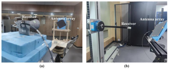 Figure 11 shows the far-field and near-field measurement setups. All the experiments are performed in free space. In the far-field measurement, a dual CP horn with an axial ratio less than 3.5 dB over 6–18 GHz and VSWR ≤ 2.5 is utilized as a receiver. The planar microstrip array is set at different azimuthal planes of ϕ = 72°, 150°, 252°, and 330° in front of the receiver, and both are connected to an AV3672B vector network analyzer to generate and receive signals. In the near-field experiment, a planar spiral antenna is displaced with a distance of 0.25 m from the central axis of the sample, and functions as the receiver and moves automatically in a maximum area of 0.2 m × 0.2 m. The microstrip quad-vortex-beam planar array is first rotated along the z axis by ϕ and then along the y axis by θ to align the central axis of the vortex beam with the receiver.