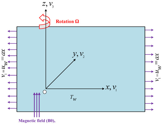 Let us analyze the steady 3D rotational flow of micropolar fluid on a stretching surface in the presence of magnetic effects subject to linear and nonlinear convection. Two forces act in opposite directions to each other and identically act in the direction of x-axis to stretch the sheet at a velocity of , and is the stretching rate. denotes the static magnetic effect which is uniformly acting in the z-direction, and under the small magnetic field Reynolds number assumption, the induced magnetic field is negligible. Further, Ohmic dissipation and Hall current impacts are neglected because the applied magnetic field is not very strong [23,24]. The viscous dissipation term is commonly discussed in very high-speed turbulent fluid flow models, particularly in situations where heat transfer is critical. In the present elaborated fluid model, the fluid speed is not fast, and fluid motion generates kinetic energy, which changes the internal fluid energy. This is an irreversible mechanism that causes localized fluid heating. The viscous dissipation term in the energy equation is usually insignificant compared to the convective and diffusive factors. That’s why viscous dissipation is ignored in this model [25,26]. Furthermore, isothermal conditions are sustained at the sheet surface, and viscous dissipation is neglected. Moreover, it is considered that and are ambient temperature and temperature at the surface. The elaborated fluid flow problem geometry is depicted in Figure 1. Because of these assumptions, the boundary layer equations governing the conservation of mass, linear momentum, micro-rotation, and thermal energy in vector form are as follows [27,28,29]: