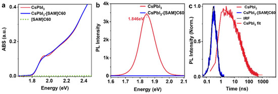 (a) Absorption spectra (ABS), (b) photoluminescence (PL), (c) time of resolved photoluminescence (TRPL) of CsPbI3 QDs and CsPbI3-[SAM]C60 QDs.