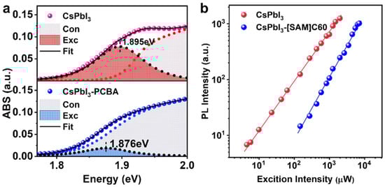 (a) The band-edge absorption of CsPbI3 QDs and CsPbI3-[SAM]C60 QDs fitted with Elliott formula (Con and Exc represent continuous band and exciton absorption, respectively). (b) Excitation power-dependent PL spectra.