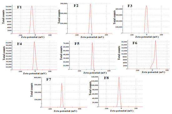 The respective average diameters of LC-loaded CS nanoparticles ranged from 278 to 415.7 nm (Table 3 and Supplementary Figure S1). The formula coded F7 (low MW CS cross-linked with ALG under low stirring at 500 rpm) showed the least particle size (278 nm) among the formulations. Formulas F7 and F8, both prepared by CS with low MW cross-linked with ALG, showed the lowest nanoparticle sizes (278 and 289 nm, respectively). The results showed low significant effect for the formulation variables on the particle size of LC-CS nanoparticles (p = 0.057). However, ANOVA showed a significant effect of CS MW and LC concentration on PDI. All formulations showed PDI ≤ 0.5, indicating homogeneity and a narrow range of distribution between particles. The results (Figure 1) demonstrated zeta potentials ranging between −2.3 and −23.1 mV. The formulas coded F1, F7, F6 and F2 showed the highest zeta potentials (>−19). F4 and F3 showed low zeta potentials (<5.7).