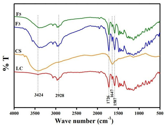 FTIR spectra of LC, CS, CS/TPP-loaded LC nanoparticles (F3) and CS/ALG−loaded LC nanoparticles (F5).