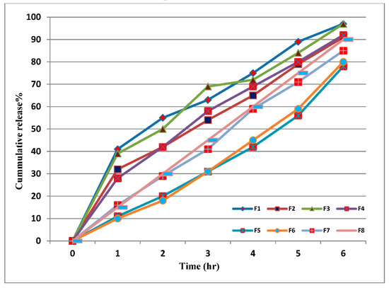 LC release profile from prepared LC-loaded CS nanoparticles (F1 to F8).