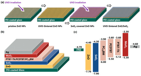 The fabrication process of the two-step UVO-ZnO/SnO2 bilayer is shown in Figure 1a. The preparation methods of water-bath ZnO NPs suspension and sol–gel SnO2 can be found in our previous work [35,36]. Generally, the ZnO NPs suspension was synthesized by hydrolysis and condensation of zinc acetate dihydrate by potassium hydroxide in methanol using a Zn2+:OH− ratio of 1:1.7, and the sol–gel SnO2 was synthesized by dissolving tin dichloride dihydrate in ethanol to form a solution with a concentration of 0.1 M. The UVO cleaner (YZUV-22C, Beijing Kenuo Instrument Equipment Co., Ltd., Beijing, China) equipped with Hg lamp was used as the platform for irradiating the ZnO monolayer or ZnO/SnO2 bilayer film. The power density of the UV lamp is about 0.5 W/cm2 and the temperature of the substrates during UVO treatment is about 70 °C [29,35]. Firstly, the ZnO NPs was spin-coated on the cleaned commercial indium tin oxide (ITO) coated glass substrate (STN-SI-10, China Southern Glass Group Co., Ltd., Shenzhen, China) and subjected to UVO sintering, then the sol–gel SnO2 precursors was spin-coated on the UVO-ZnO NPs, and UVO sintering was performed again to finally obtain ZnO/SnO2 bilayer film. The sintering time of the ZnO-coated monolayer film and the ZnO/SnO2-coated bilayer film was 20 min and 60 min, respectively.