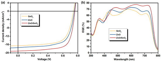 The positive effects of the UVO-ZnO/SnO2 bilayer CBL on the device performances can also be confirmed from the corresponding external quantum efficiency (EQE) characteristics as shown in Figure 2b. The devices with the UVO-ZnO/SnO2 bilayer CBL exhibits a prominent enhancement response in the wavelength range of 450–750 nm as compared to that of the devices with UVO-ZnO and UVO-SnO2 CBLs, resulting in a substantial increase in Jsc. In addition, the EQE value of the devices with UVO-ZnO/SnO2 CBL surpasses 70% at around 600–700 nm, indicating an efficient photo-to-electron conversion.