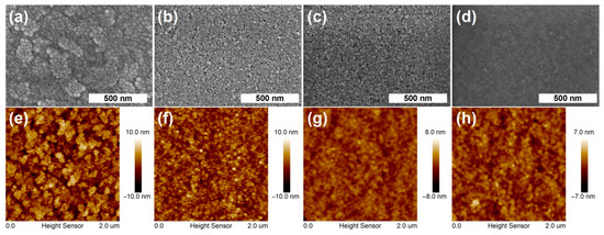 The SEM (a–d) and AFM (e–h) images of different films, (a,e) ITO, (b,f) UVO-ZnO, (c,g) UVO-SnO2, (d,h) UVO-ZnO/SnO2.