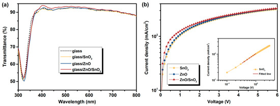 The insertion of the SnO2 layer not only improves the interface contact between the active layer and the CBL, but also optimizes the optical and electrical properties of the CBL. Figure 4a presents the optical transmittance spectra of the UVO-ZnO, UVO-SnO2 and UVO-ZnO/SnO2 CBLs. The results show that the additional inserted SnO2 layer does not negatively affect the optical properties of the ZnO layer, but slightly improves the transmittance to the photons with wavelengths in the range of 400–600 nm. This interesting phenomenon has also been reported in other literature [30,35], and one of the possible reasons should be that the smooth surface is more conducive to the transmission of photons [41]. In this case, the UVO-ZnO/SnO2 shows a smoother surface compared with the UVO-ZnO and UVO-SnO2, as revealed by the AFM images. More photons pass through the CBL into the active layer, which enhances the photon absorption in the active layer and helps to improve the Jsc of the devices. Moreover, the electrical properties of the CBL is also critical to the PCE of the devices. The electron transfer characteristics of the different CBLs are investigated by using the space-charge-limited current (SCLC) model, and the electron-only devices (ITO/CBLs/ternary active layer/Al) are fabricated. The electric field-dependent electron mobilities in the active layer were calculated through the following equation [38], where ε0 is the permittivity of free space, εr is the relative permittivity of the material, μ is the hole (μh) or electron (μe) mobility, V is the applied voltage and L is the thickness of the active layer. As shown in Figure 4b, the UVO-ZnO/SnO2 devices exhibit the highest electron current density, which will contribute to the enhanced Jsc for the corresponding devices. The electron mobility was calculated by fitting the space charge limited region according to Childʹs law (as displayed in the inset in Figure 4b), and the calculated electron mobility is 4.3 × 10−4 cm2V−1s−1 for the UVO-ZnO, 4.6 × 10−4 cm2V−1s−1 for the UVO-SnO2 and 8.1 × 10−4 cm2V−1s−1 for the UVO-ZnO/SnO2. The devices with UVO-ZnO/SnO2 exhibit the highest electron mobility, which will undoubtedly achieve the most efficient electron extraction and transport, thereby improving the Jsc and FF of the devices.