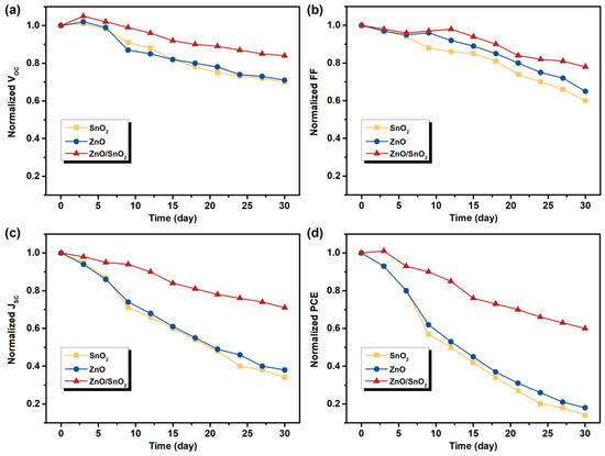 Stability measurements in ambient air. The variation of normalized (a) Voc, (b) FF, (c) Jsc and (d) PCE over a period of 30 days for the devices with UVO-ZnO, UVO-SnO2 and UVO-ZnO/SnO2 CBLs.