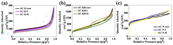 Nitrogen adsorption–desorption isotherms of all investigated series of the obtained samples: (a) AC–O; (b) AC–KB; and (c) AC–N.