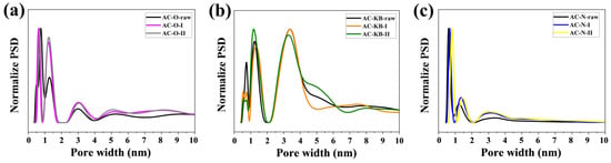 Pore size distribution obtained from the adsorption branches of N2 used the nonlocalized density functional theory (NDLFT) method of all investigated series of the obtained samples: (a) AC–O; (b) AC–KB; and (c) AC–N.