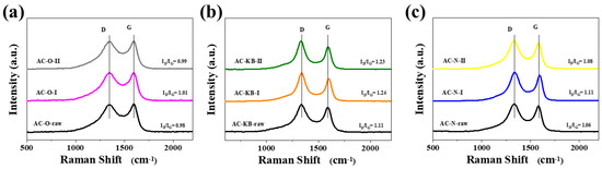 Raman spectra of all investigated series of the obtained samples: (a) AC–O; (b) AC–KB; and (c) AC–N.