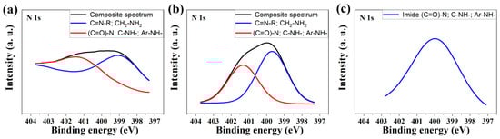 The XPS spectra of representative samples (Figure 7) show two peaks at 399.1 and 401.3 eV, which are characteristic of nitrogen (N1s). Peaks at 399.1 eV correspond to C=N–R, CH2–NH2 or in the form of pyridine [39]. In turn, the peak at 401.3 eV corresponds to (C=O)–N–(C=O), -NH–(C=O)–O or the -NH- group attached to an aromatic ring [38].